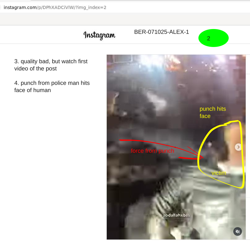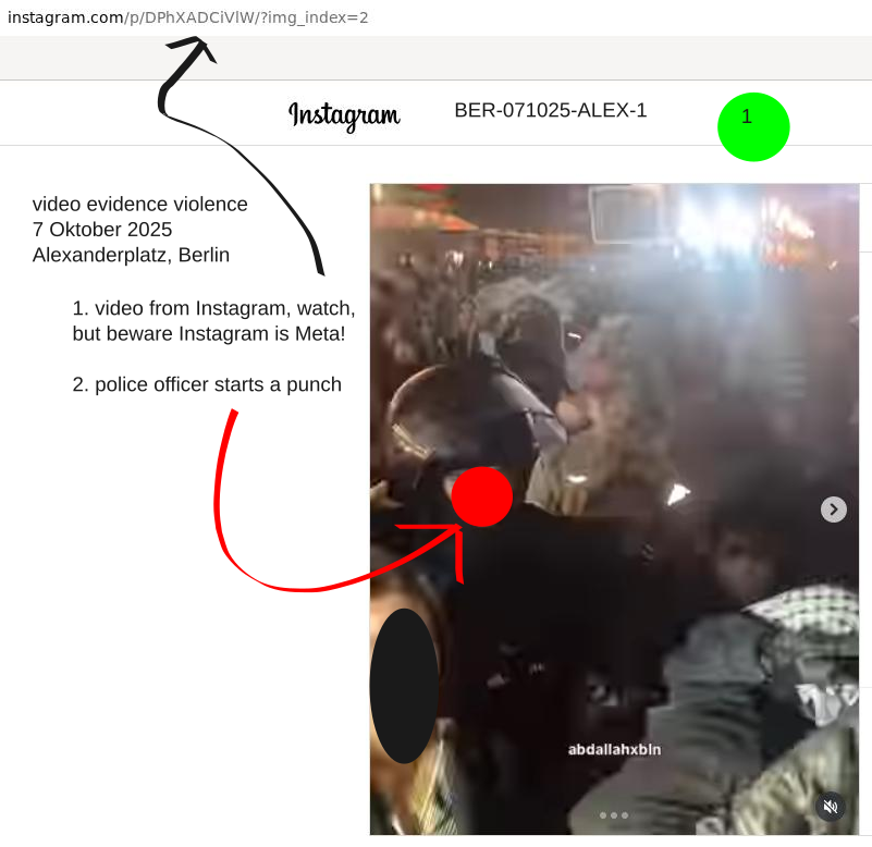 We are starting with this violent action by a police officer close to Alexanderplatz in Berlin on October 7 2025 -> https://instagram.com/p/DPhXADCiVlW/ Note that Meta is watching you. The video is the source and the evidence. We now collect.